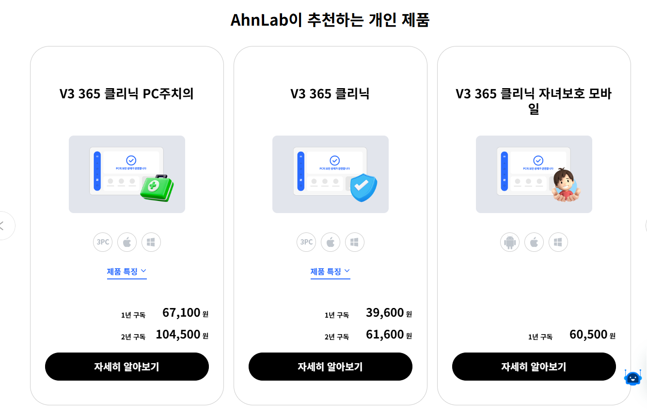 - 종합적인 PC 보호와 고급 보안 기능, PC 최적화 도구, 그리고 전문적인 지원 서비스를 원하시는 분들은 V3 365 클리닉이 더 적합한 선택이 될 것입니다.